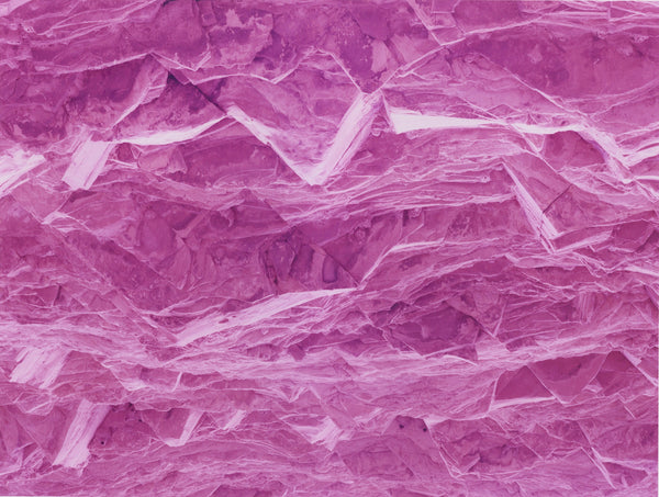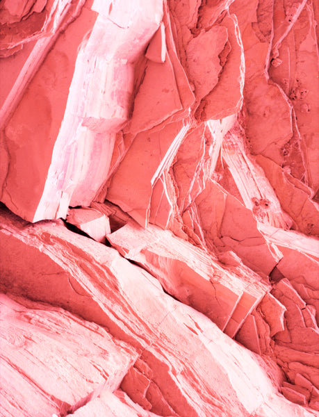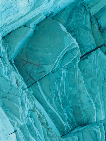 Earth Changes launches the vitality of Sherry’s abstractions of the landscape into three-dimensional space. Ten immense, dyed rocks rise from pedestals of varying heights, and are tightly packed to enact the experience of hiking through the desert. The stones’ saturated color emphasizes their natural striations and markings. Twelve photographs, varied in size and printed in stunning color, present close-up views of Big Bend National Park’s cliffs, ledges, and mineral deposits. The jagged outcrops and rugged terrain in the images parallel the sharp, angular forms of the quarried rocks. To echo the size and placement of the sculptures, Sherry playfully scattered his prints at various heights along the gallery walls.