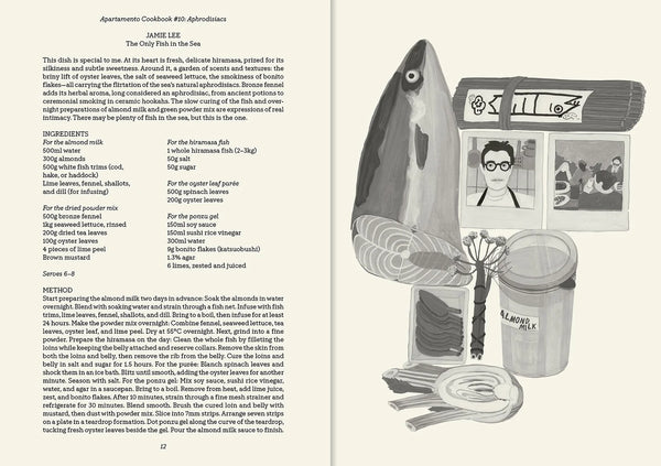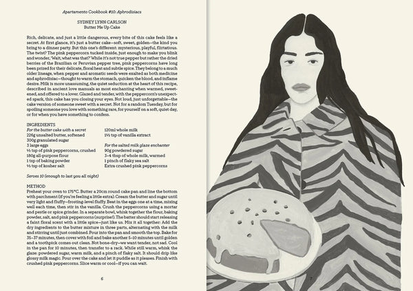 For the 10th anniversary of Apartamento Cookbooks, Cookbook #10: Aphrodisiacs—illustrated by celebrated artist Maria Sainte— includes 16 recipes from lovers, ex-lovers, and food lovers from around the world. Romantic, playful, shy, obsessive, enduring—Aphrodisiacs brings together a world of creators: from patisserie experts Alessandro Giannatempo and Flora Manson, to beloved chef couple Anna Archibald and Kevin Serai, to internet muse Sydney Lynn Carlson and Afro-vegan chef Gloria Kabe.